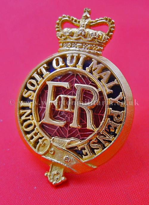 Household Cavalry Officers badge, Queens Crown, frosted gilt burnished fully fretted regimental title and ERII cypher centre backed by red/blue vitreous enamel - (1/2 inch lugs) - Firmin, very scarce.