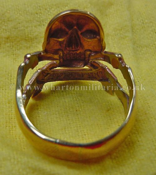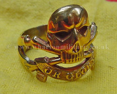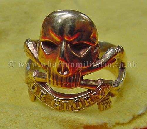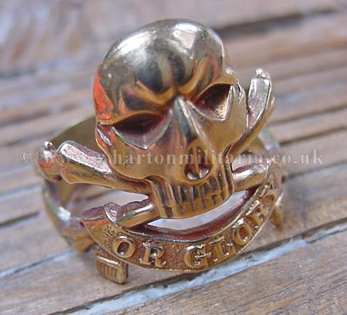 A scarce gold coloured 17th Lancers ring, in excellent condition, has been worn, internal diameter is 22mm approx. I don't think its gold as it shows signs of having two joins or enlargements - a thin band of silver shows at the joins, passes magnetic test, may be silver with gold plating. A lovely ring, excellent detail, 10g in weight.