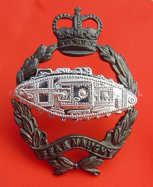 An exceptionally rare, original and unissed Officers 2 piece cap badge to the Royal Tank Regiment circ 1970s. The badge is by Gaunt though is not maker marked. This is an outstanding quality Officers 2 piece badge, silvered tank with bronze wreath and crown. The blades are un-bent as unissued. The badge is very similar to the last Kings Crown pattern, early 50s, and is the Queens Crown variation of that earlier badge. It is exceptional quality, crisp of detail and basically unissued/unworn. The detail is outstanding. This was one of a number held by the QM of 3RTR for Officers and Warrent Officers, also worn by the band WOs for a while.