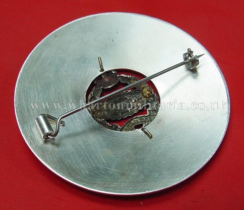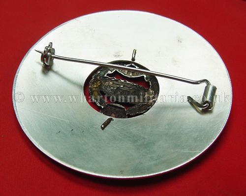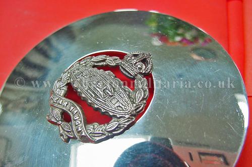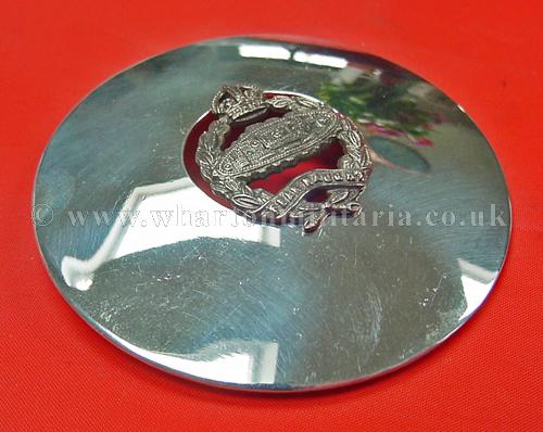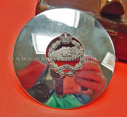 Royal Tank Regiment plaid brooch/disc, in excellent to unworn condition, approx size 70mm dia. silver plate, large brooch pin to back. A very nice looking plaid most likely associated to 4RTR or the Pipes and Drums. It is possible this plaid is earlier as the badge in the centre has the right facing tank associated with the short time of the Royal Tank Corps.