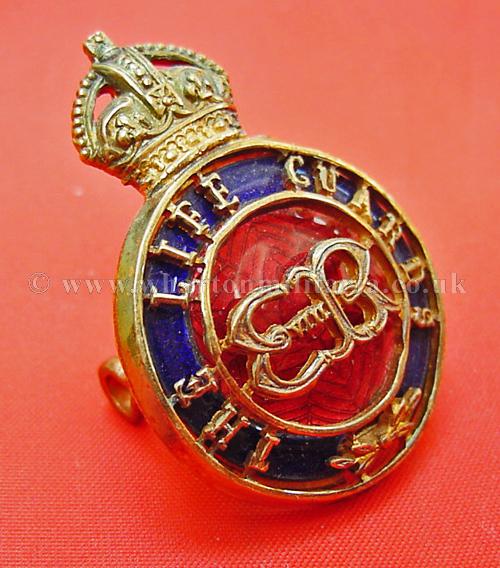 The Life Guards Officers, Kings Crown, frosted gilt burnished fully fretted regimental title and Edward 8th cypher centre backed by red/blue vitreous enamel - (1/2 inch lugs) - Firmin, extremely scarce.