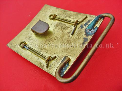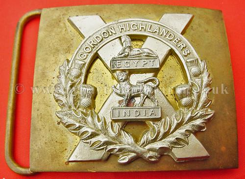 Gordon Highlanders cross belt plate, in excellent condition, rectangular brass plate bearing a white metal Gordon Highlanders device. To the rear 2 pins secure the front device, the fixed loop and clip are present, a nice shoulder cross belt plate.