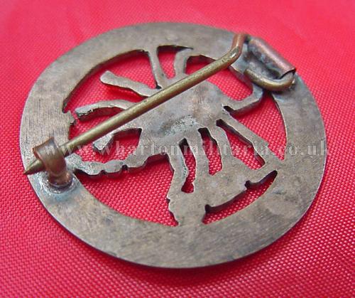 WW2 Long Range Desert Group cap badge, first style without the raised rims, unusually fitted with a pin - there are no signs of having had lugs previously though the pin could be positioned over such, the pin is well fitted, some signs of wear but in very good condition, a scare badge to find as an original period example, especially with a brooch pin.