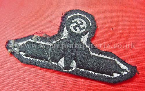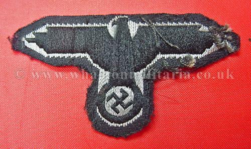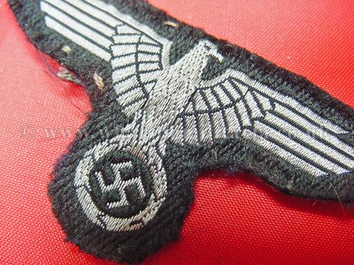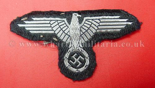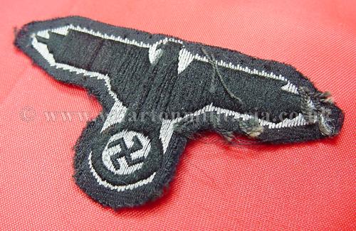 An excellent quality reproduction SS cap eagle, German made bevo style, being reproduced off an original bevo machine and pattern, a very presentable cap eagle.