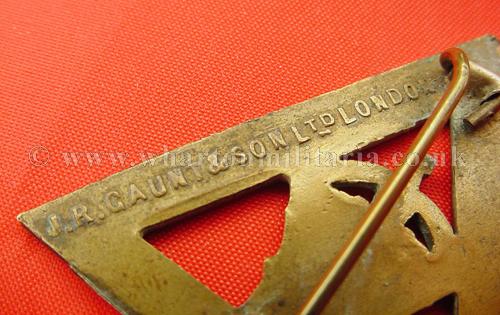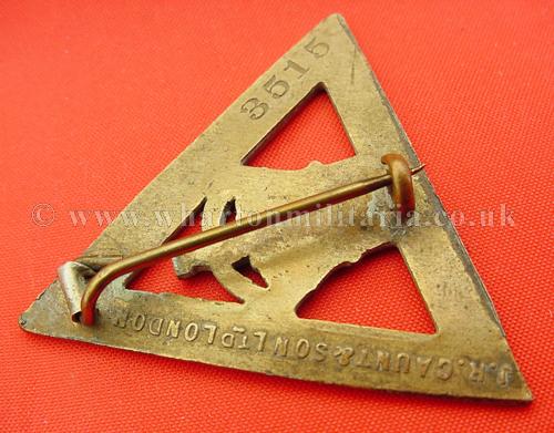 WW1 munition workers service badge, has individual issue number and makers details for Gaunt to the reverse. Has king's crown and date "1916" on a tablet to the centre, triangle edge bearing "On War Service ".