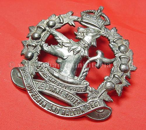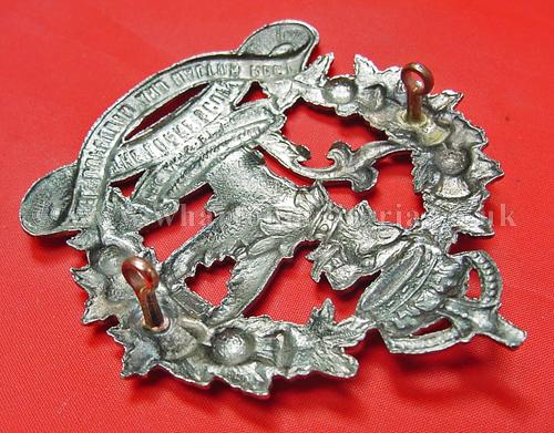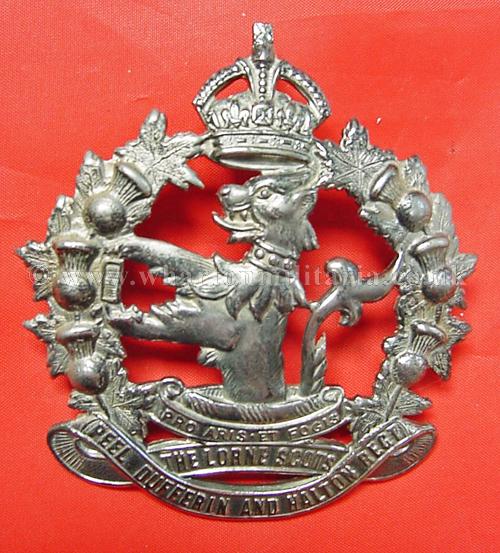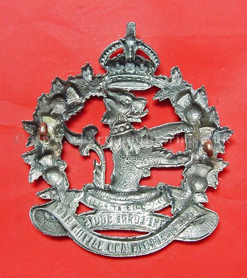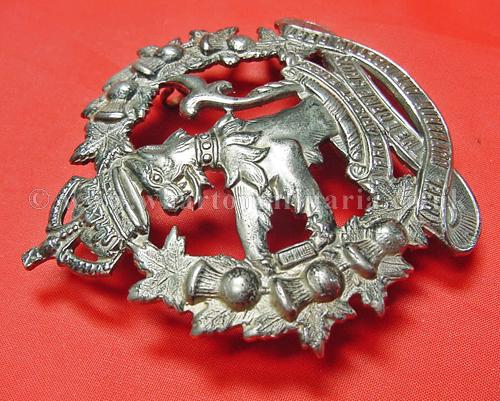 A difficult to find Canadian Lorne Scots, Peel Dufferin and Halton Regiment glengarry badge, circ 1935 - 1936, both lugs intact, approx size 3 x 2 1/2 inches, lovely badge, maker marked 'Scully Ltd Montreal'