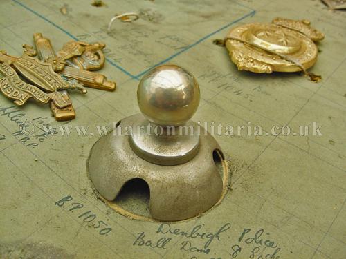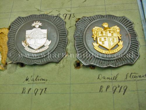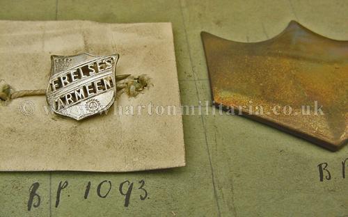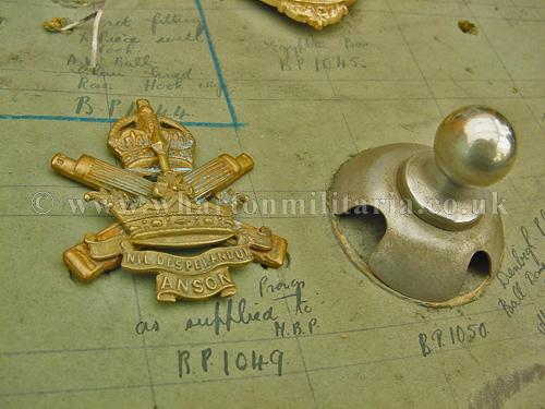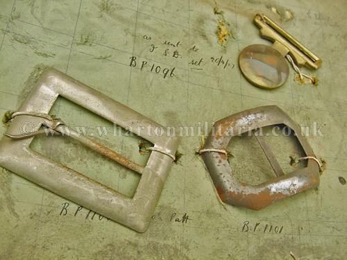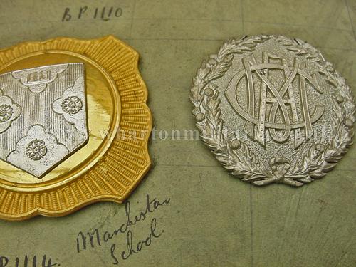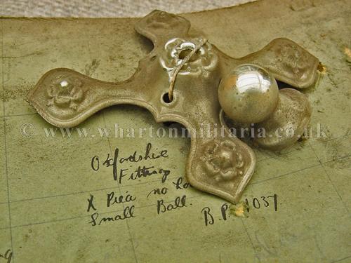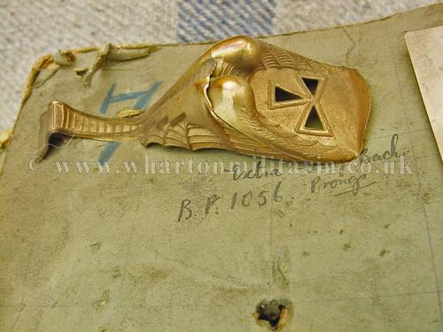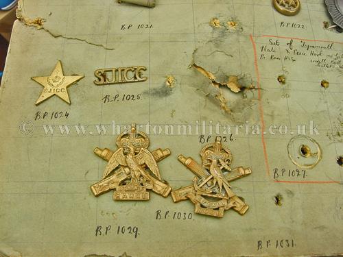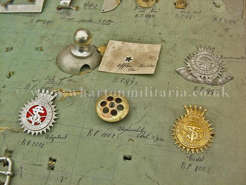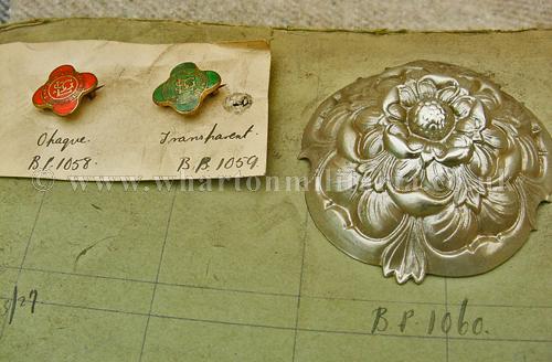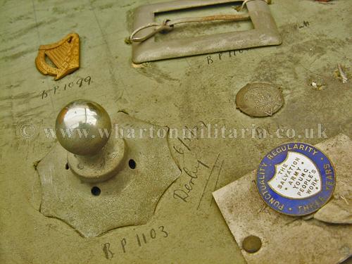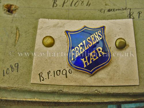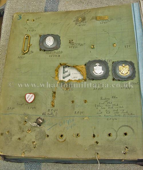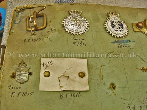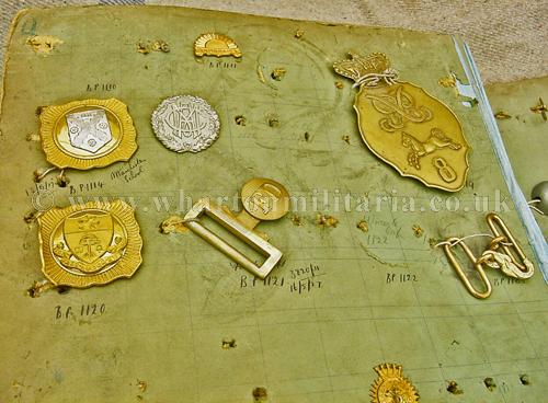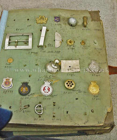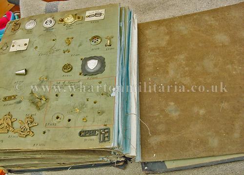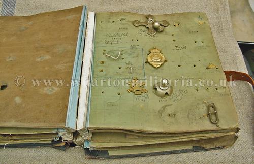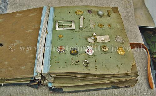 A very scarce Gaunt pattern book, book cover dated 1926 though some of the badges are clearly WW1, there are some military, Salvation Army, Scottish Clans, Police and a number of foreign items, there are badges, helmet parts, fittings, belt parts, quite a wide range of items were secured inside, book is not in good shape, holes have been cut to allow helmet tops to go between pages, really interesting and something quite different, can't be many of these survived.