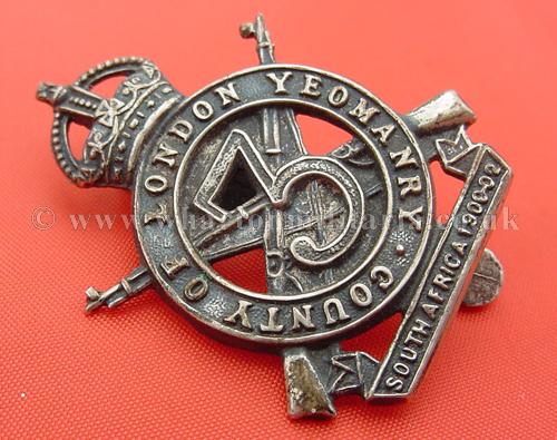 A very scarce solid silver (tested) cap badge to the 3rd County of London Yeomanry, excellent condition and patina, very little wear, slider marked 'silver' along with some maker type marks - 3 shields and a star - lovely badge not often found in silver, most likely a private purchase from a London Jeweller.