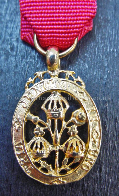 The Most Honourable Order of the Bath - Knight Grand Cross (GCB) Miniature sash badge, a scarce miniature for the order, these don't often come up, in excellent condition retaining its gilt finish and correct ribbon, a good opportunity for the collector of miniatures, this example is 26mm from the bottom to the top of the ring that the ribbon ring passes through, including the ribbon ring overall height is 36mm.