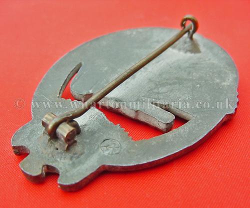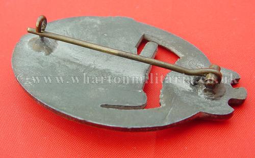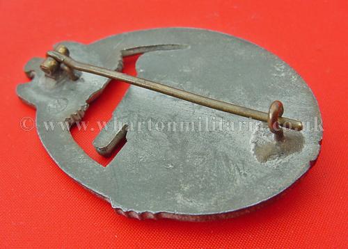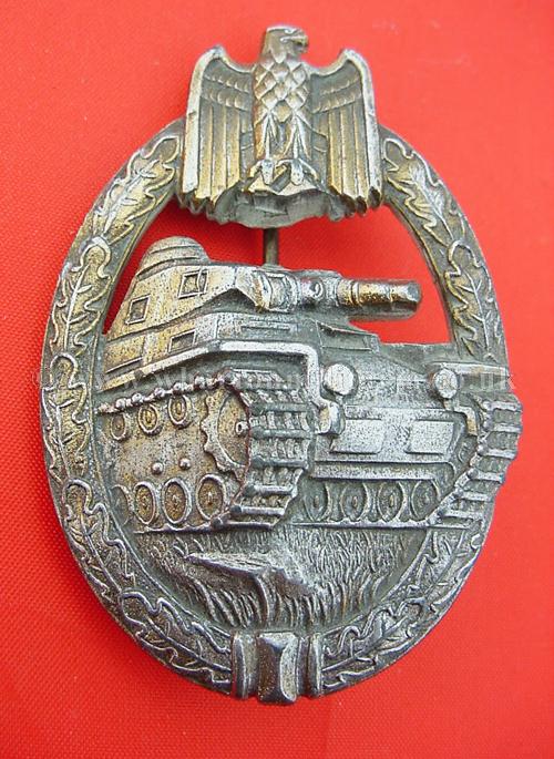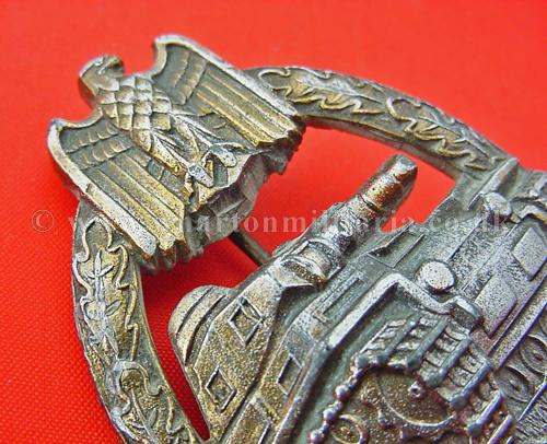 Army Panzer Assault badge in bronze, zinc with some bronze finish remaining, in very good condition albeit that it has been denazified, maker logo marked with the encircled 'KWM' for Karl Wurster of Markneukirchen, a nice specimen badge priced to reflect its denazified condition.