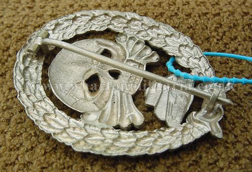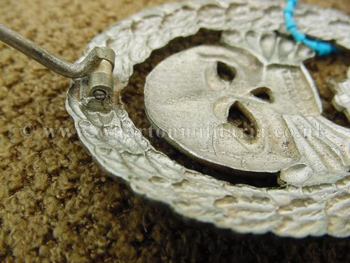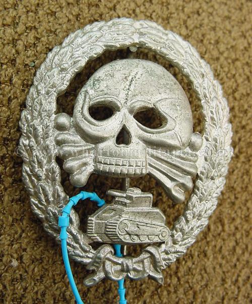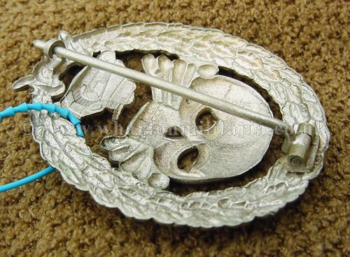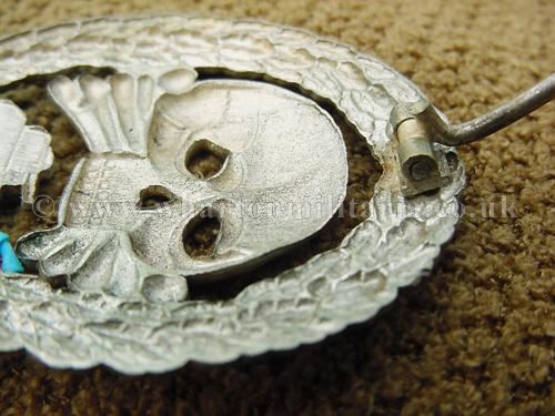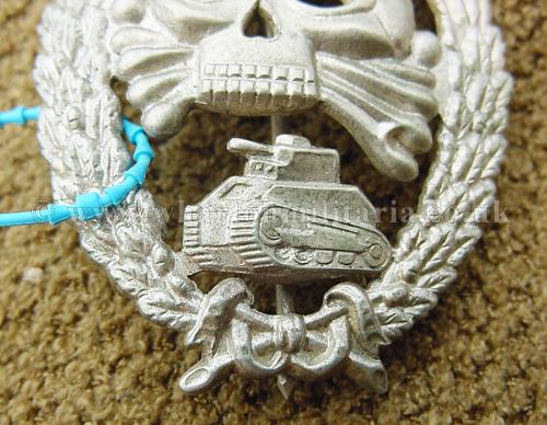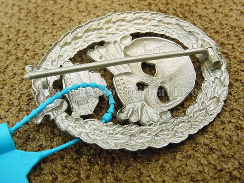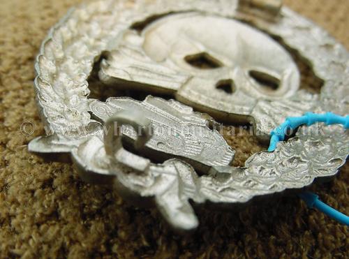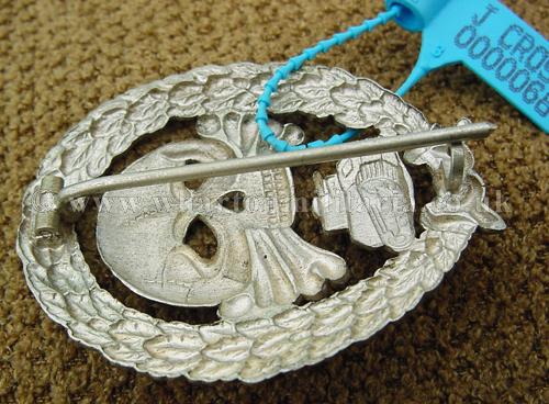 An extremely scarce early Tank Assault badge for the German and Spanish tank crews serving in the Spanish Civil War. The badge is the German issue and is in excellent condition retaining all finish. A non maker marked badge, with the correct needle pin and hook for the German made badge. Examples of both types of this badge are extremely hard to find especially in this mint condition. An ex-Jamie Cross sale retaining Jamie's numbered seal along with his original certification document for the badge. Simply Rare.