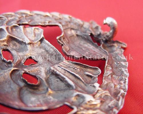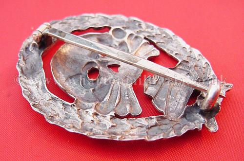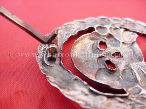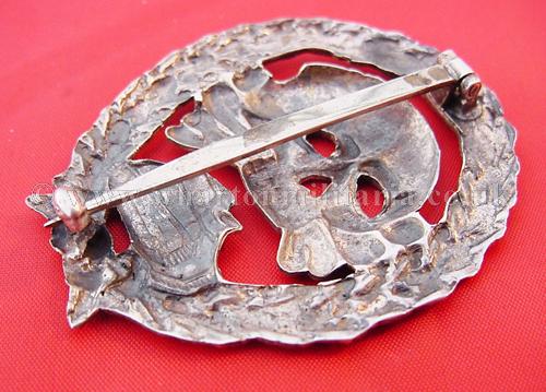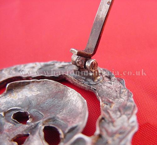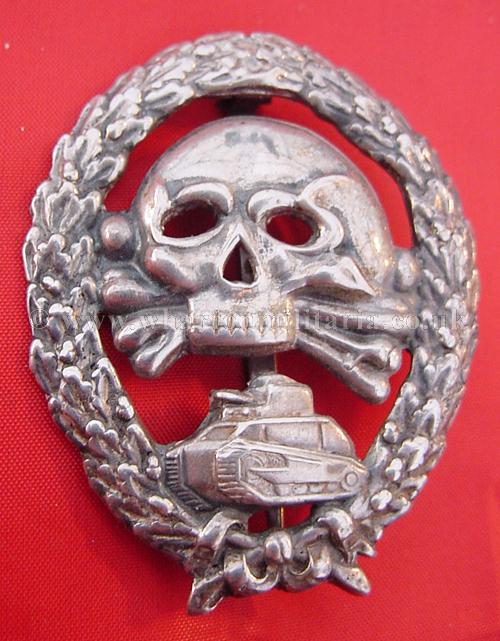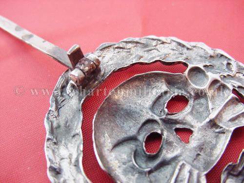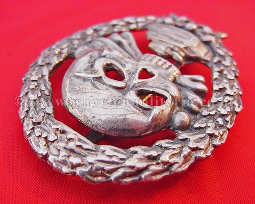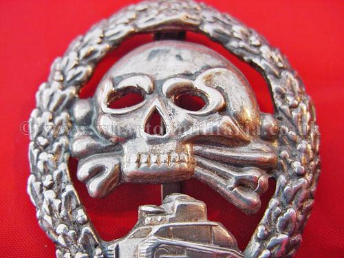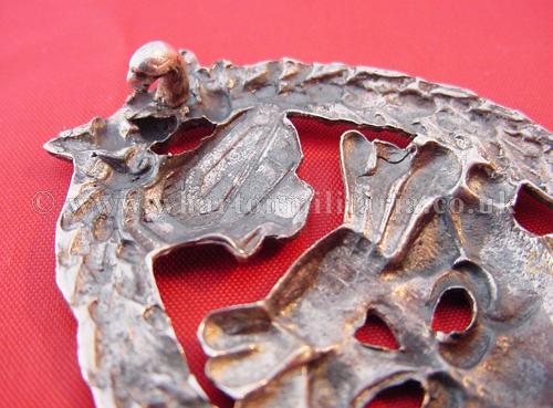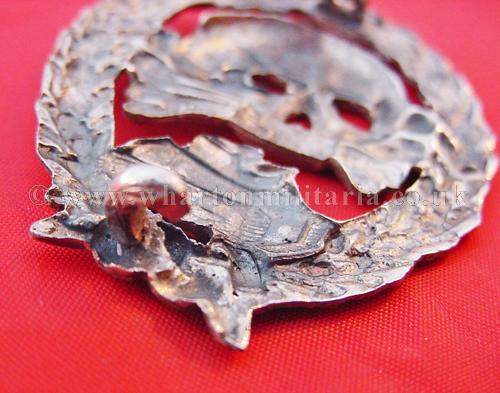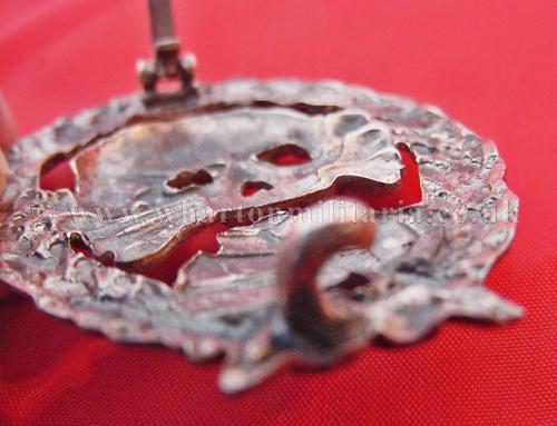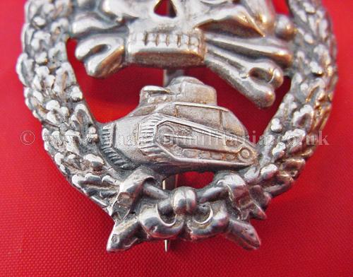 An extremely scarce early Tank Assault badge for the German and Spanish tank crews serving in the Spanish Civil War. The badge is solid silver and is in excellent condition with minimal wear. A non maker marked badge, with the correct broad to needle point pin and thick hook for the Spanish made silver examples. Examples of both types of this badge are extremely hard to find.
