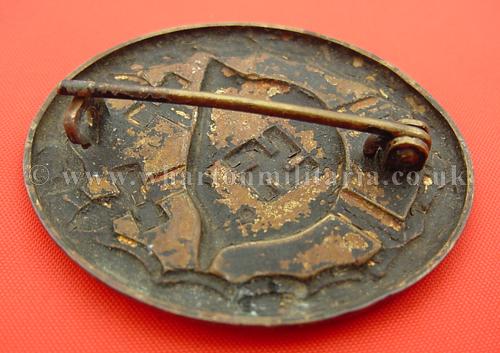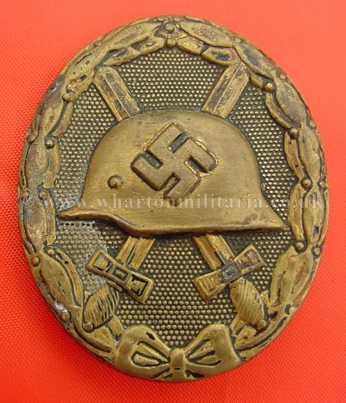 WW2 Black Wound Badge, early pressed type, black finish almost worn away to show the brass base metal, fine early badge with minimal signs of wear. Possibly stripped of its colour for use as a 'gold' wound badge as often happened.