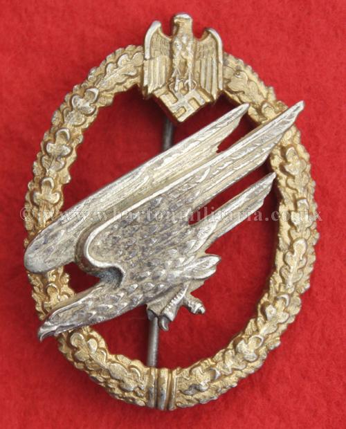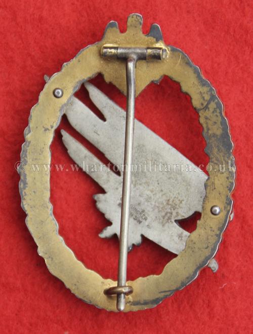 Very rare Army Fallschirmjager Paratroopers badge in excellent condition with crisp detail, eagle is maker marked ‘CE Junker Berlin SW’ - needle pin, a specimen example of this very scarce and desirable badge by a sought after manufacturer. Mid to late war zinc made badge.