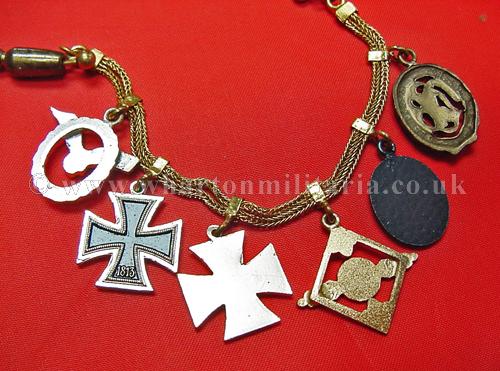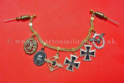 A scarce and difficult to acquire Luftwaffe Fighter Pilot's 1957 awards and honour chain, in excellent condition, chain has the Pilots badge, Iron Crosses - sometimes two ICs also denote the Knights Cross and the Iron Cross 1st class - Fighter clasp, wound badge and sports award, a very nice chain. Chains were popular with WW2 veterans and those that continued into the post war German armed forces. A most sought after item that is hardly found outside of Germany.
