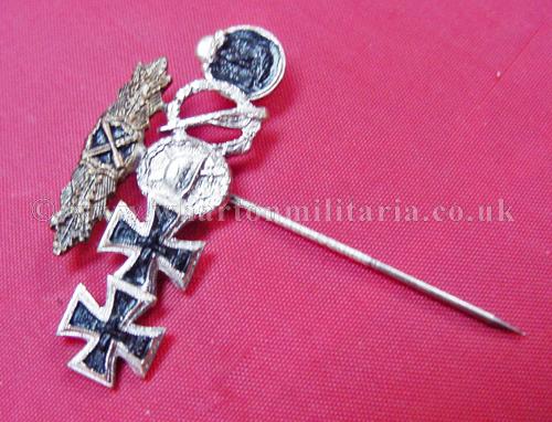 Stickpin 1957 8mm - Group of 6, Close Combat Clasp in Bronze, Iron Cross 1st & 2nd Class, Silver Wound Badge, Infantry Assault and the Eastern Front Medal. A fine stickpin group of miniatures.