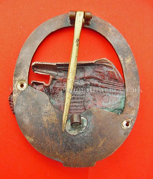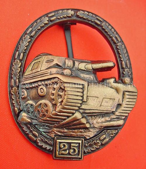 1957 Panzer Assault badge in bronze ~ 25 Engagements, 2 piece construction, early 1960s manufacture, excellent example of this badge.