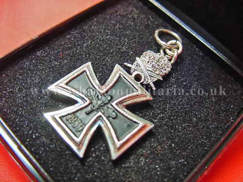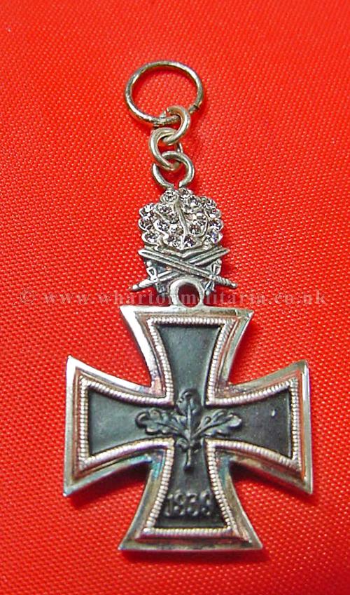 A scarce 1957 Knights Cross of the Iron Cross, Oakleaves, Swords and Diamonds miniature for the formal ribbon bar, very well made, fine detail, stamped '800' silver on the rear of the Oakleaves, size approx 40mm from base of KC to top of ring and 18mm wide across KC, official miniatures are not often seen, a nice set to the top end of the Knights Cross hierarchy.
