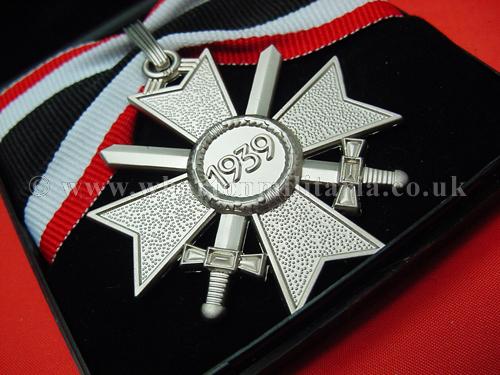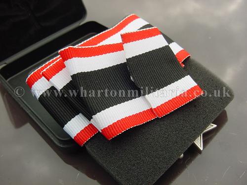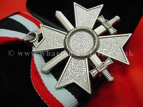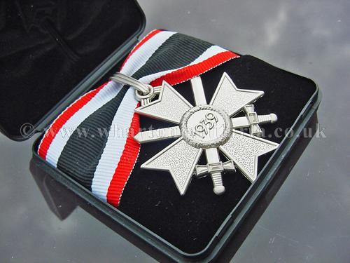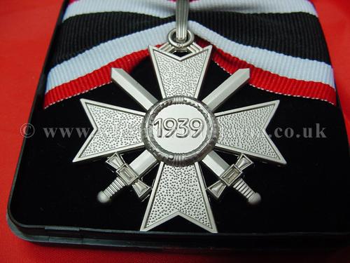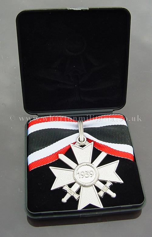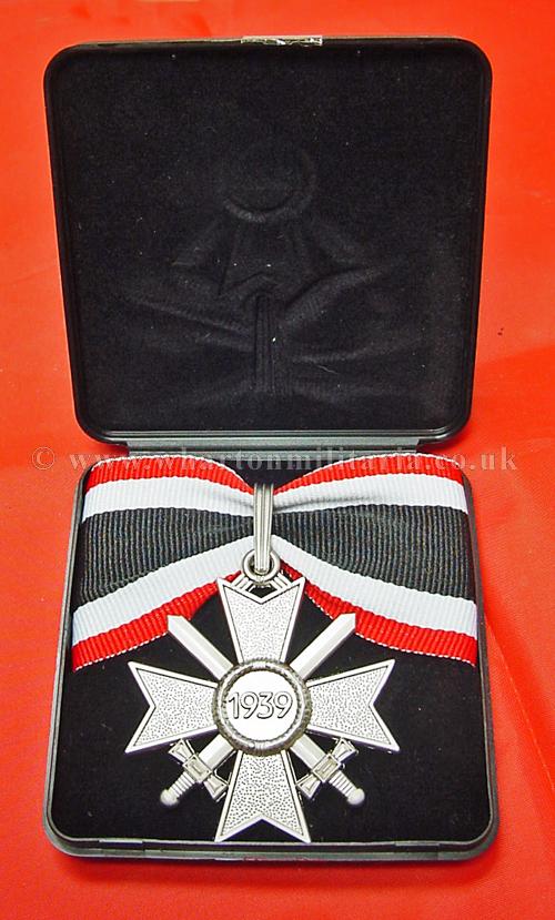 A really lovely example of a 1957 issued Knights Cross of the War Merit Cross with Swords within its case of issue. The cross is as issued retaining all of its finish, most likely not worn as the post war servicemen began to favour the use of ribbon bars and dress miniatures rather than the full size awards. The cross is maker marked '41' (Gebruder Bender - Idar-Oberstein a.d. Nahe) on the front of the medal ring and '800' on its reverse, complete with its ribbon, which is clean. The case is near mint with minimal sign of handling. The inside of the case has a velvet like black base that the ribbon and cross rest on. A scarce award even as a 1957 issue especially being made on wartime dies.