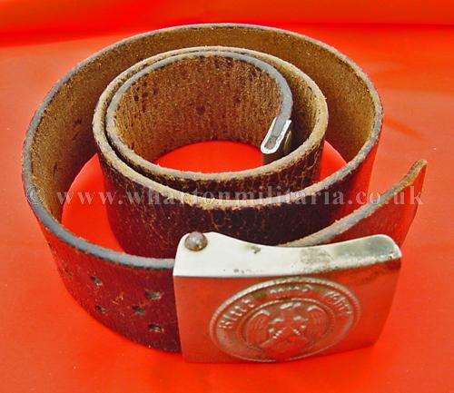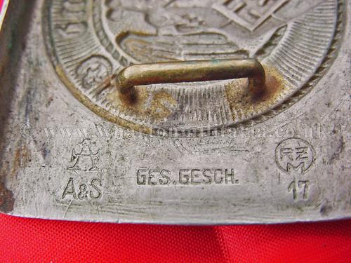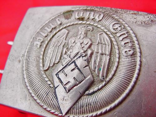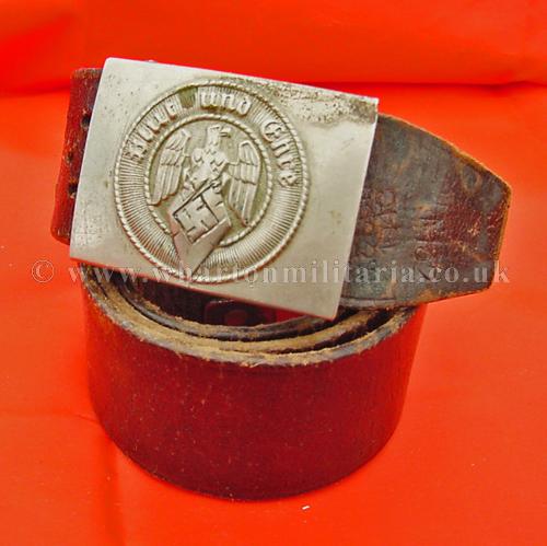 HJ nickled steel buckle, with almost no wear retaining good crisp detail to eagle and centre piece. Buckle is marked Ges. Gesch. A&S RZM 17, still on its original belt, belt is marked and dated 1943 plus has other marked numbers. A nice HJ buckle with a belt reflecting the variable waist size of its wearer during the war