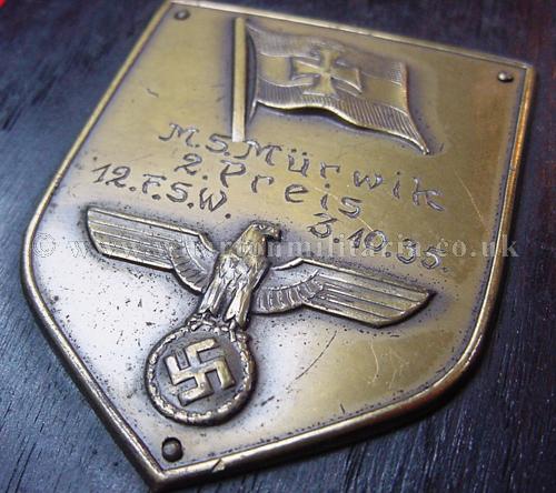 Third Reich period Kriegsmarine award plaque for sports, in excellent condition overall, nice patina, approx size is 4.25 x 5 inches / 11 x 13 cm, shows the Imperial Naval flag and the winner's details above a Third Reich eagle, a nice period sports plaque.