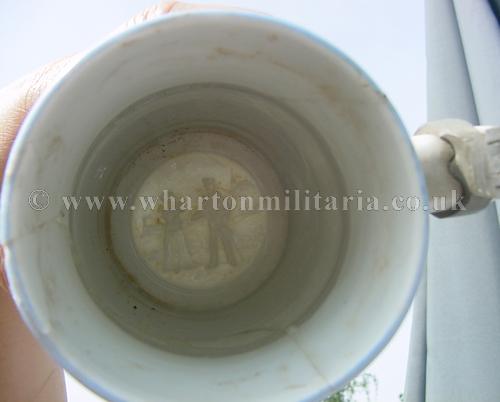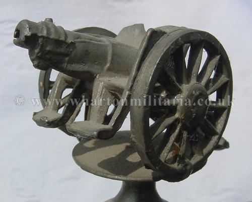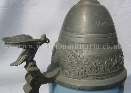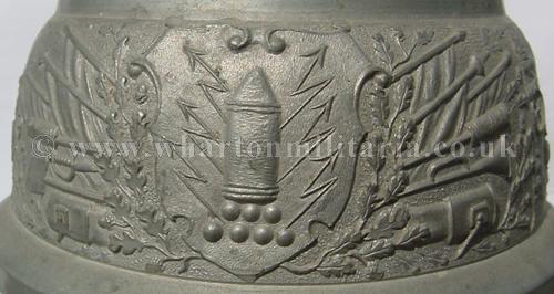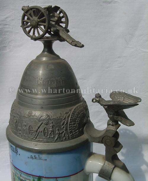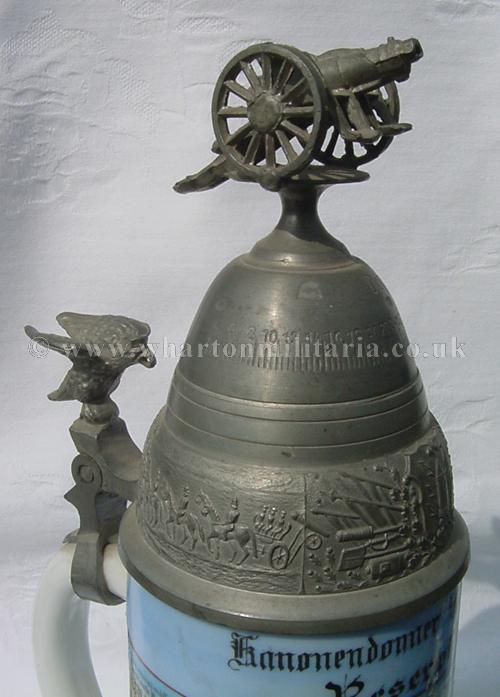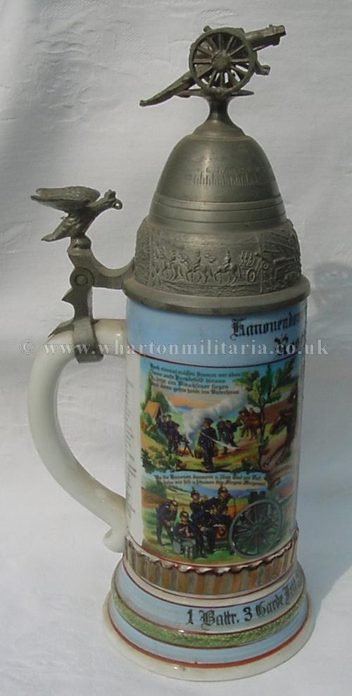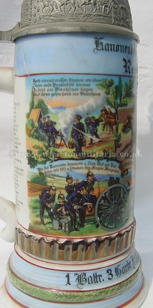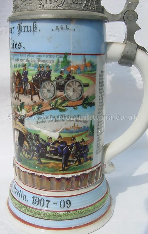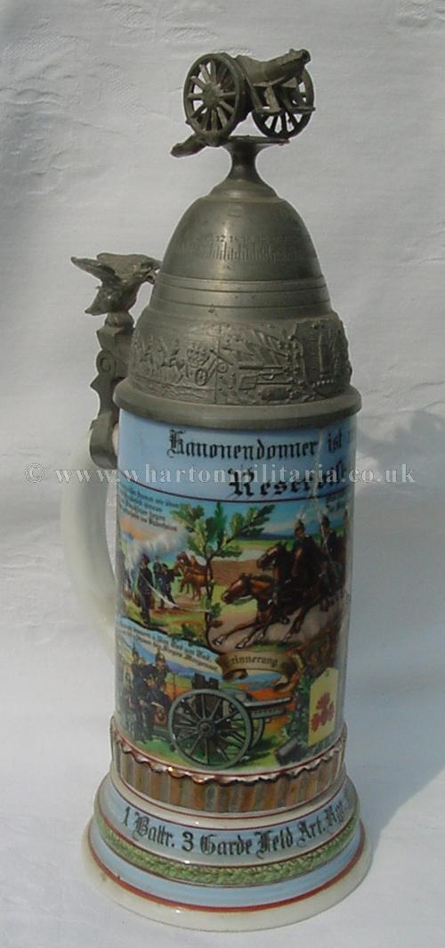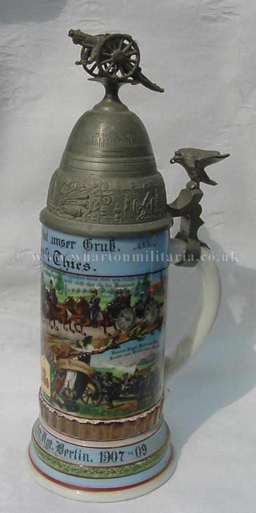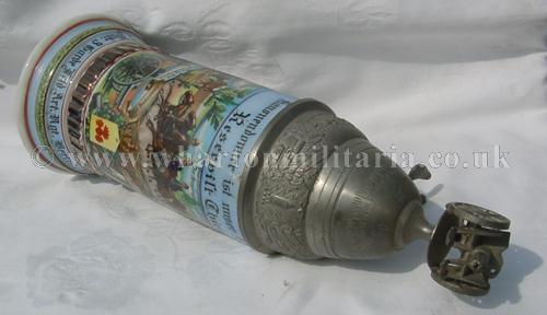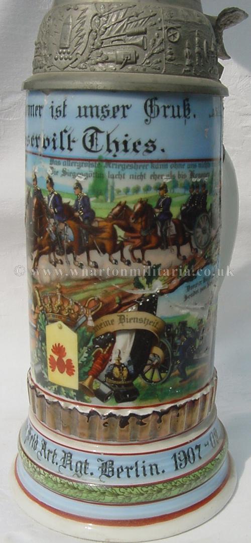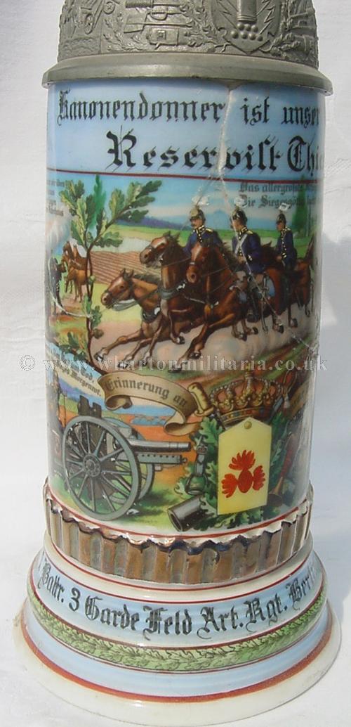 WW1 Veteran's commerative stein, shaped as per an artillery round head. Metal top/cap as round fuse with an artillery field gun to top and imperial eagle sat on handle top mechanism. Shown to '1 Battr. 3 Garde Feld Art. Regt. Berlin. 1907-09'. Images show an artillery horse team pulling the gun and carrying troops on the limber, the soldiers at rest around a fire, the gun team laying-on and a yellow shoulder board shape with the red artillery exploding grenade motif. An excellent piece but has had some repairs which is reflected in the price. Complete and quite rare.