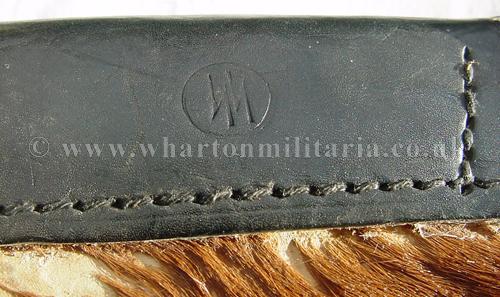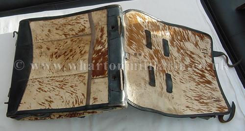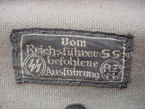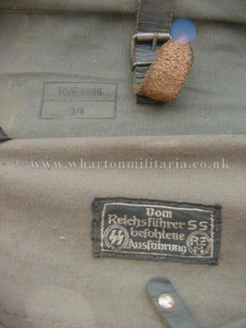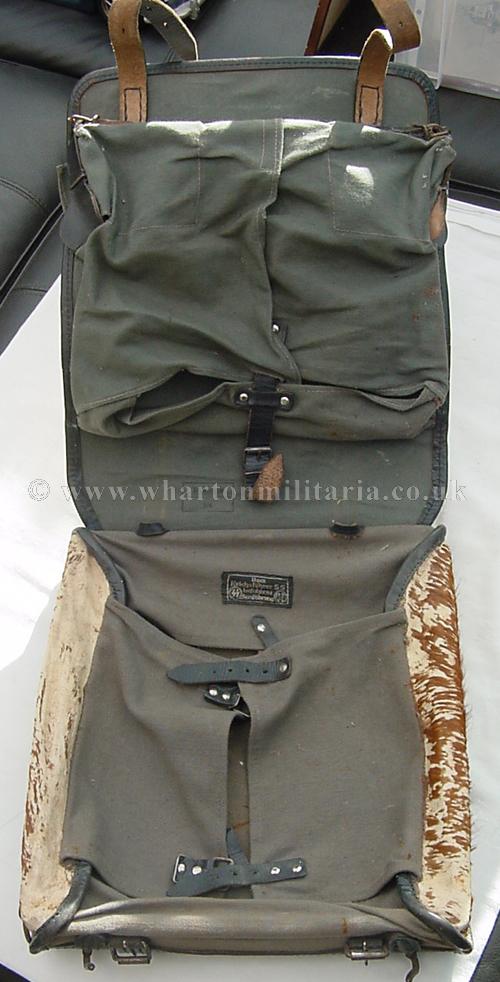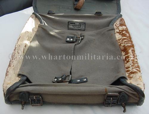 A pre-war cloth and leather SS Tornister fur covered back pack without carrying straps. This tornister frame is in excellent condition as is the pack overall, the flaps and cloth flaps are all clean, the fur cover is sparse though in good condition and does not smell. No bottom edge scuffing through wear and chaffing against belts which is a bonus. The tornister has an SS issue tag and unit stamp as well as the former owners details on the inside edge. The rear leather panel has the stamped runes. The pack is approx 13" x 12" x 2" inches in size. An excellent example of an early SS tornister in good condition