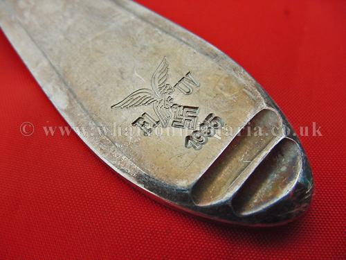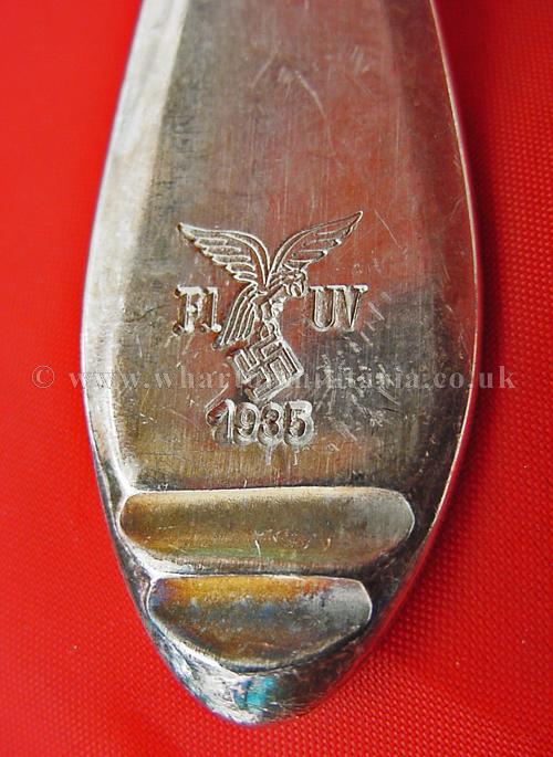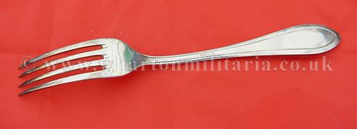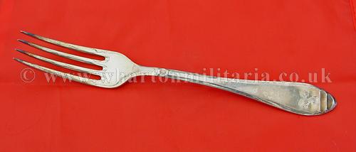 Luftwaffe Argenta 90 silver plate table fork, approx. 21cm in length, nicely stamped 'Fl.U.V.' with the eagle through the middle, dated 1935 under the Luftwaffe eagle and swastika, a heavy quality tableware marked with the Argenta brand along with the Lion and '90'. A very nice item of plate tableware.
