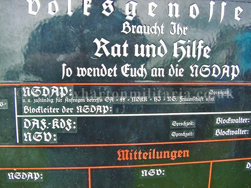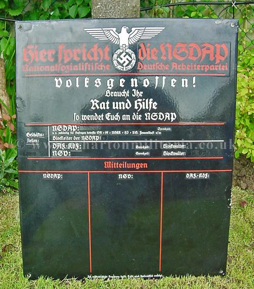 A scarce large enamel communication shield of the WW2 German NSDAP, with it's legend `Here speaks the NSDAP National Socialist German Arbeiterpartei` in absolutely excellent condition. Black enamel sign with red and white lettering on the panel, covers the offices of the NSDAP (SA, SS, NSKK, HJ, etc) as well as DAF, KDF and the NSA, all information related to those offices were published along with their business hours, plus any notification for releases of the NSDAP, NSV and the DAF-KDF publications, newspapers and leaflets. In excellent condition, a couple of slight bumps in the corners with signs of touching up of minor enamel chips, size 80 cm x 65 cm, very rare in this fine condition, rarely found Nazi enamel sign, very iconic and a good centre piece for a collection.