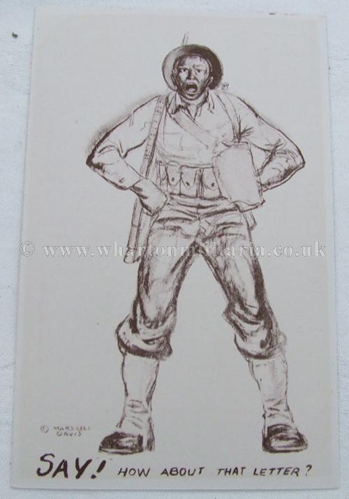 WW1 circ US Forces postcard ~ showing the US GI complaining about no mail from home, postcard entitled 'Say! How about that letter?', postal unused, good condition as per the photographs, undamaged, taken out of a photograph album. Postcard of a drawing by Marshall Davis.