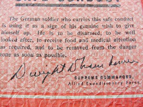 An extremely rare WW2 Allied printed "Passierschien" Safe Conduct Pass leaflet, printed in both English and German, these were dropped over Germany by the Allies to encourage the German forces to surrender. The German Serviceman bearer of the Safe Conduct Pass would allowed to surrender without fear of harm. This leaflet, printed code ‘ZG61’ was dropped from September 1944 to March 1945. The leaflet bears the printed name and signature of General Dwight D. Eisenhower, Supreme Commander, Allied Expeditionary Force. These are increasingly difficult to find these days.