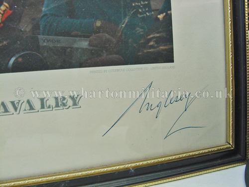 A fully framed and well presented military print of 'Waterloo: The Charge of the British Cavalry' by Denis Dighton, signed by 7th Marquess of Anglesey. This is a limited edition print especially with the late Marquess's signature, the original art work is within the National Trust Collection and can be seen at Plas Newydd, Angelesey. The print is in beautiful condition, published 1976 by The Wellington Collection, National Army Museum, London, 1976 and personally signed in graphite by the Marquess of Angelesey, a scarce and collectable print.
