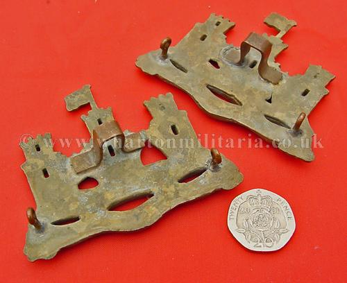 Inniskilling Fusiliers helmet plates, unusual pair of heavy brass badges, approx 73mm wide by 60mm in height, two lugs and a bar formed loop to the rear, quite substantial - possibly cross belt badges.
