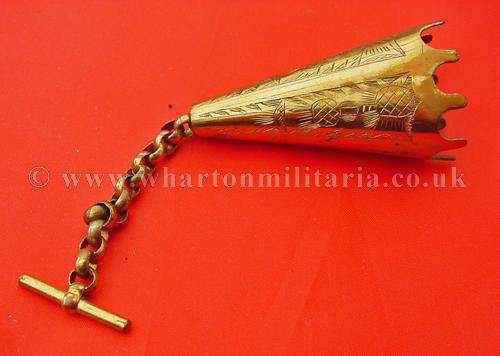 A scarce Scottish Volunteers aiguillette shoulder chape to a Gordon Highlanders Volunteer Officer in unused condition, the aiguillette cords are clasped by the chape to hold the cords with the chain and clip to attach into the button hole, finely made, thistle design, retaining all gilt, chape size approx 2 1/2 inches. A very nice and quite scarce item.