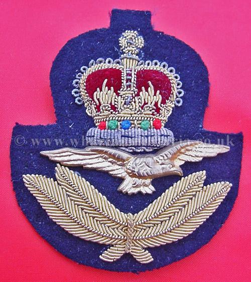 Royal Air Force Officers cap badge, gilt metal eagle under red velvet Queens Crown, and above gold bullion wire laurel sprigs, unused condition, nice example.