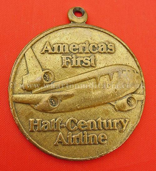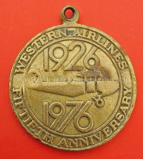 An interesting 50th anniversary medal to the American Western Airlines, in good overall condition, appears to be manufactured in brass, approx 40mm diameter. One side has an image of an aircraft with the words 'America's First Half-Century Airline' with the reverse side showing an older bi-plane between the numbers '1926' and '1976' with the words 'Western Airlines Fiftieith Anniversary' around the medal edge. Top of medal has a suspender ring. Interesting anniversary medal.