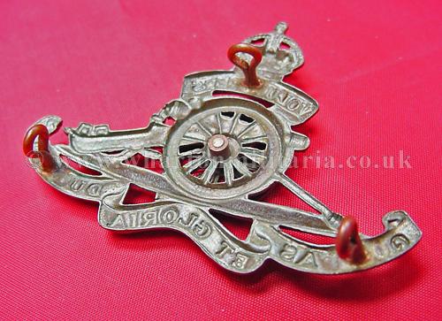 Royal Artillery 'Volunteers' cap badge, KC, in white metal, mounted wheel, all lugs intact.