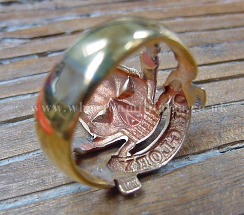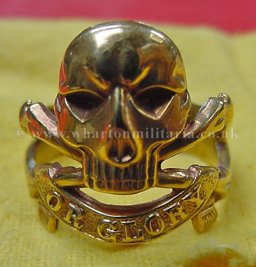 A scarce gold coloured 17th Lancers ring, in excellent condition, has been worn, internal diameter is 22mm approx. I don't think its gold as it shows signs of having two joins or enlargements - a thin band of silver shows at the joins, passes magnetic test, may be silver with gold plating. A lovely ring, excellent detail, 10g in weight.