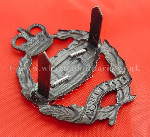An exceptionally rare, original and unissed Officers 2 piece cap badge to the Royal Tank Regiment circ 1970s. The badge is by Gaunt though is not maker marked. This is an outstanding quality Officers 2 piece badge, silvered tank with bronze wreath and crown. The blades are un-bent as unissued. The badge is very similar to the last Kings Crown pattern, early 50s, and is the Queens Crown variation of that earlier badge. It is exceptional quality, crisp of detail and basically unissued/unworn. The detail is outstanding. This was one of a number held by the QM of 3RTR for Officers and Warrent Officers, also worn by the band WOs for a while.