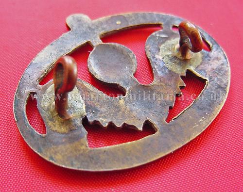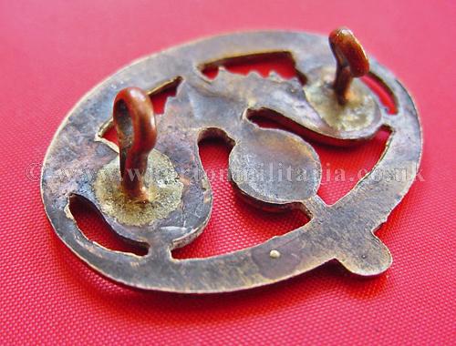 A scarce badge worn by members of the 9th Battalion, Tank Corps and later 9 RTR - the badge granted by the French in 1918 to the 9th Batt. Tank Corps following the Battle of Moreuil, the badge was the divisional badge of the French 3rd Infantry Division - Examples of this badge were worn on the sleeve as late as 1946, and do appear on contemporary RTR photographs of that period. A number of variations exist from the originally worn French badge to those then made by British manufacturers. A sought after badge.