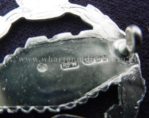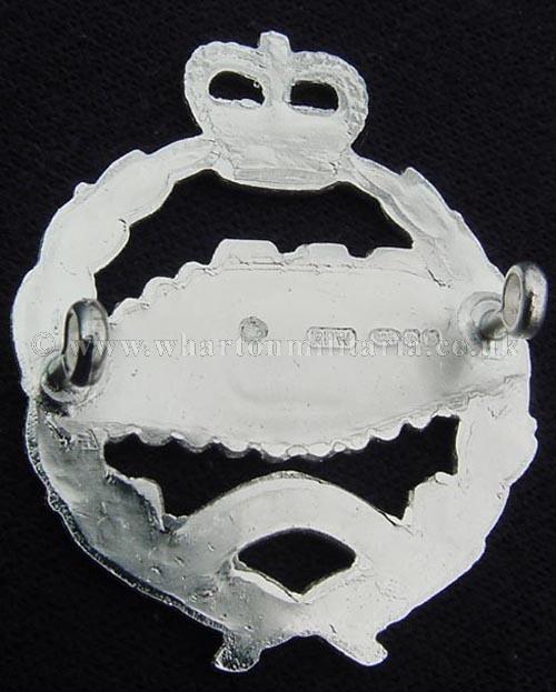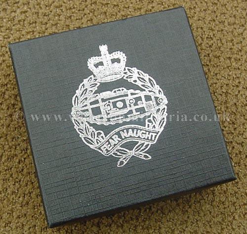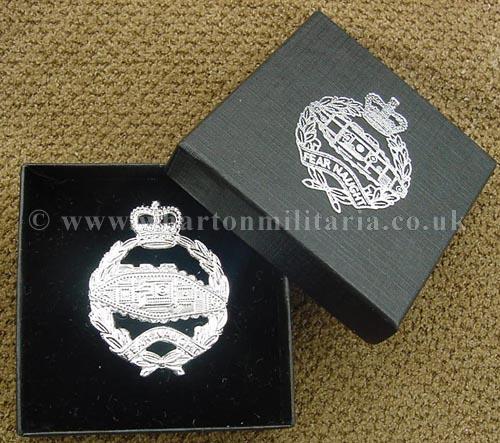 A hallmarked, solid silver Royal Tank Regiment cap badge, scorpion jeweller's mark, still retained within its presentation box. Box has the RTR regimental badge cut into the box lid, a very high quality silver badge often used as a presentation piece as well as being worn throughout the Royal Tank Regiment by both SNCOs and Officers. This badge is both an investment and a choice purchase of current insignia.