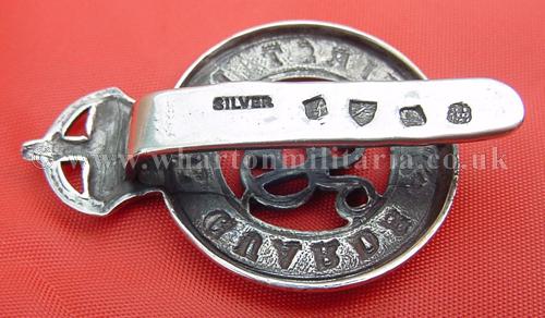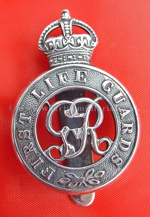 First Life Guards Officers, Kings Crown, GVR cypher, solid silver, marked 'silver' on the slider along with four manufacturers marks, these are not Assay Office hallmarks, more jewellers marks as was common practice, especially typical with London made badges for military outfitters. A very nice solid silver badge, most likely a private purchase badge as were most items of Officer wear.