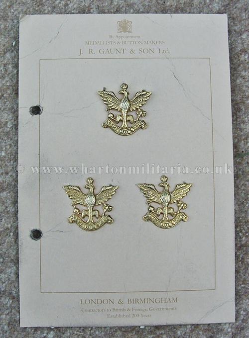 A scarce set of 26th Hussars Officers cap and collar badges still on their Gaunt sample or issue card, badges are in excellent condition though the collar badges have minimal signs of wear on the eagle chests, collar badges have the shorter length lugs, nice to fine a matching set. More pictures of badge backs in due course. Scarce set of badges.