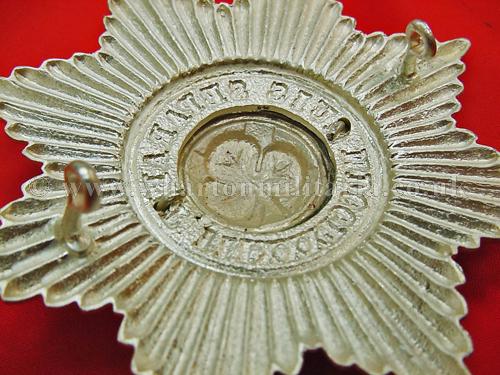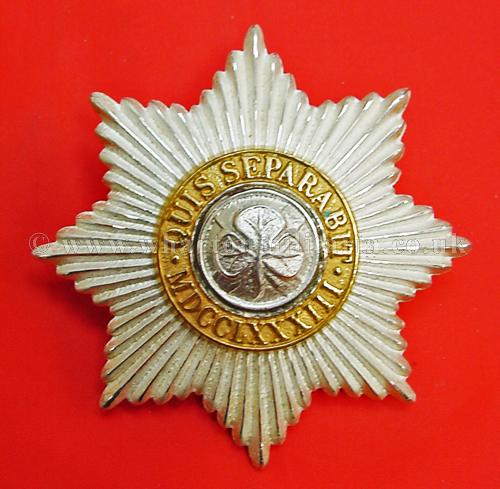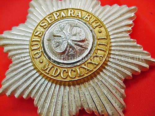 A scarce Irish Guards Officers valise badge, beautifully frosted finish, multipiece construction, both lugs intact, approx 80x80 mm, a top quality officers badge that is very difficult to obtain.