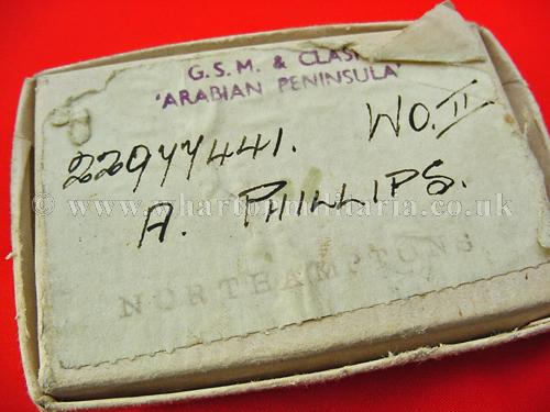 Northamptonshire Regiment cap badge in brass and white metal along with GSM Medal issue box and WOII rank sleeve badge, all in good condition, box is the issue of the GSM with 'Arabian Peninsula' clasp, to 22977441 WOII A Phillips, Northamptonshire Regiment. Sadly no medal but an interesting little group that might one day find the GSM out there.