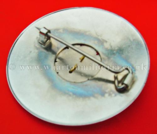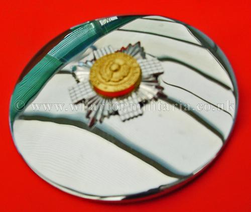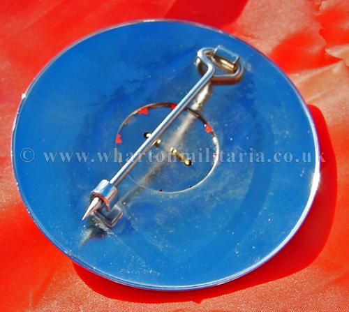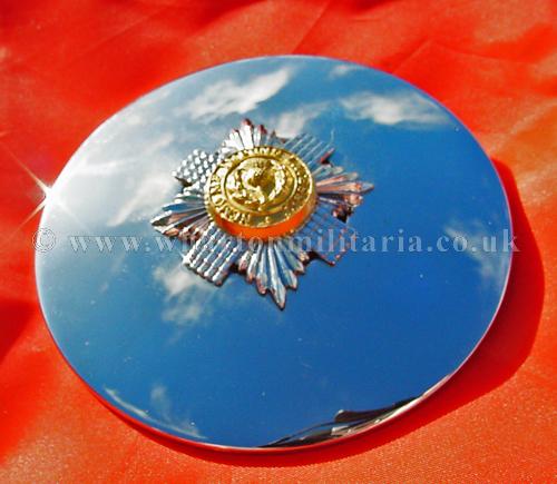 Plaid brooch of the Royal Scots in unissued condition, bi-metal badge mounted upon polished white metal plaid disc, approx. 3.5 inches diameter, worn by the Pipes and Drums as well as Regimental Associations. Excellent regimental brooch.