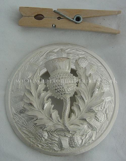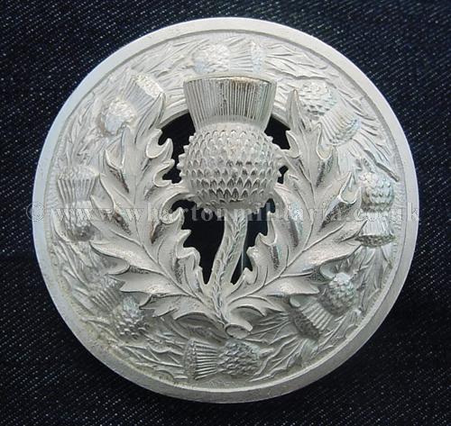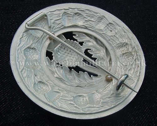 Plaid brooch of the Royal Scots in unissued condition, silver thistle upon white metal mount with light burnish. Worn by the Pipes and Drums as well as Regimental Associations. Excellent brooch.