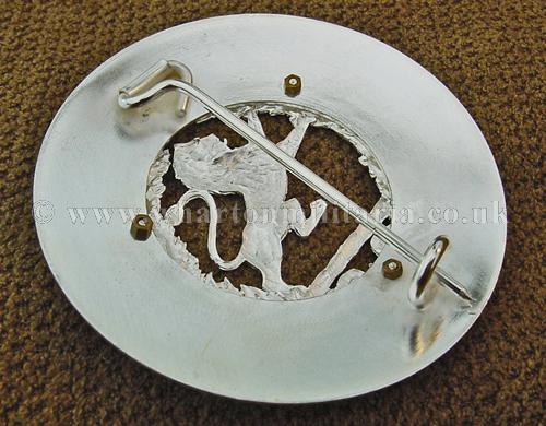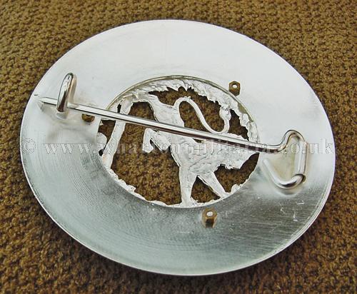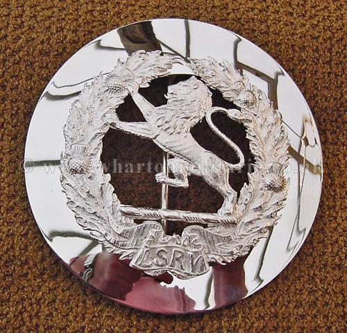 Plaid Brooch to the London Scottish Reserve Volunteer in unworn condition. Beautifully presented plaid brooch, approx diameter 3 3/4 inches (96mm), multi-piece construction, frosted silver finish on polished plate disk. A scarce and sought after plaid brooch.