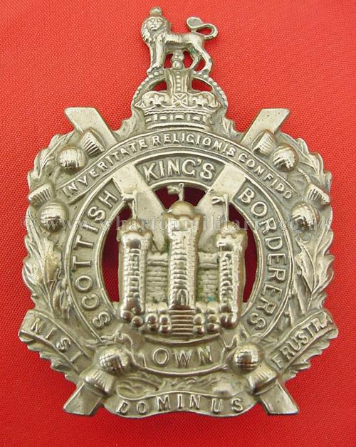 Kings Own Scottish Borderers cap badge, KC, white metal