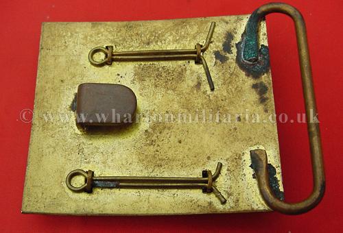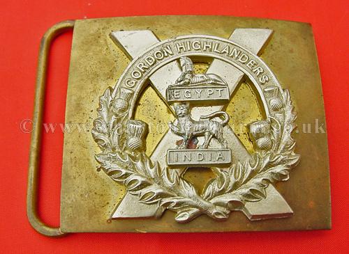 Gordon Highlanders cross belt plate, in excellent condition, rectangular brass plate bearing a white metal Gordon Highlanders device. To the rear 2 pins secure the front device, the fixed loop and clip are present, a nice shoulder cross belt plate.